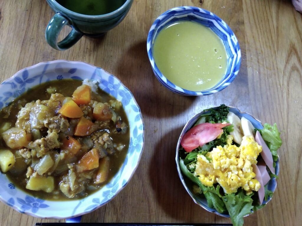 カレ―ライス、キャベツのポタ-ジュ、サラダ