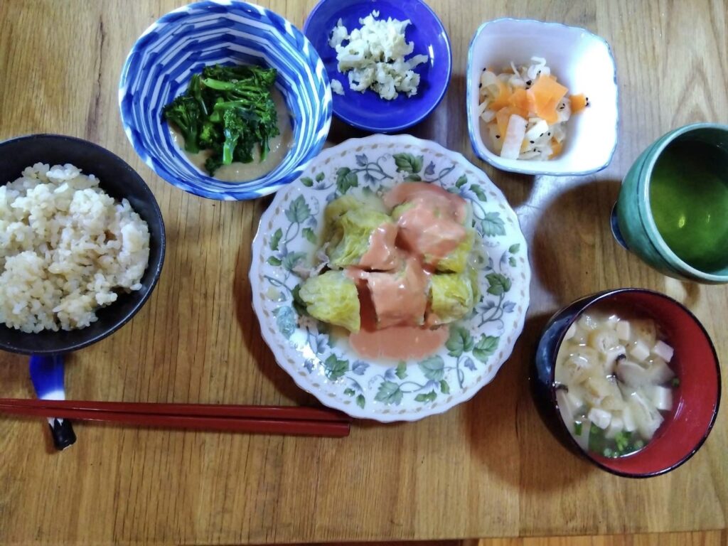 ロ-ルキャベツオーロラソース、ブロッコリ-の胡麻和え、酢の物
